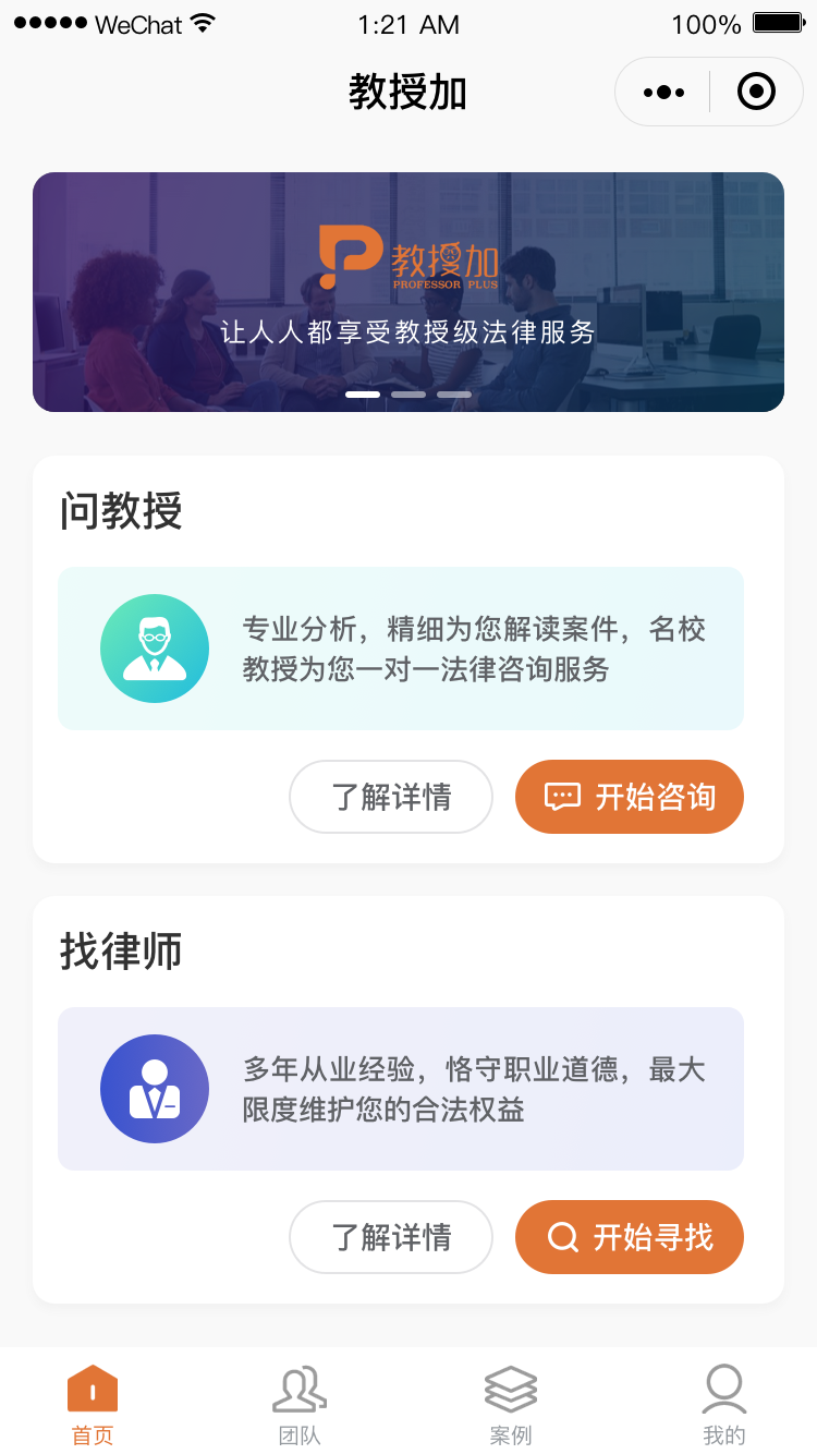 问教授: 选择教授,可以通过筛选城市或案件类型,找到符合自己的教授,然后进行选择中意1-3个教授,进行下单 | 视频通话: 视频通话一对一服务,在视频房间中可以有教授与用户进行一对一兑换,在旁听者包括教授秘书、副秘书来记录视频通话中的问题 |